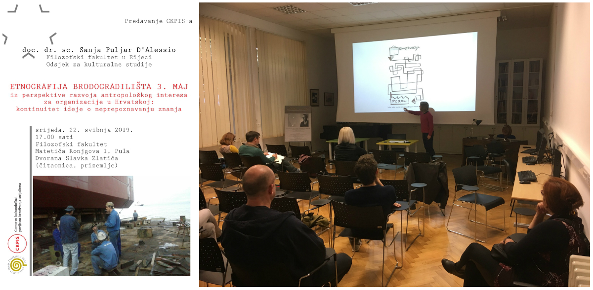 Sanja Puljar D'Alessio, docentica na Odsjeku za kulturalne studije Filozofskog fakulteta u Rijeci, u srijedu, 22. svibnja 2019., u 17.00 sati na Filozofskom fakultetu, u Dvorani Slavka Zlatića (Ronjgova 1, prizemlje, čitaonica) održala je predavanje Etnografija brodogradilišta 3. maj iz perspektive razvoja antropološkog interesa za organizacije u Hrvatskoj: kontinuitet ideje o neprepoznavanju znanja.