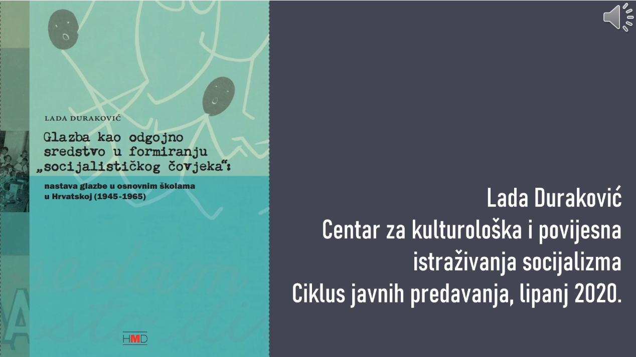 Lada Duraković (Sveučilište Jurja Dobrile u Puli, MA i CKPIS) na Youtube kanalu CKPIS-a govori o svojoj knjizi Glazba kao odgojno sredstvo u formiranju „socijalističkog čovjeka“: nastava glazbe u osnovnim školama u Hrvatskoj (1945-1965) (Hrvatsko muzikološko društvo, Zagreb, 2019., Muzikološke studije br. 21, CeKaPISarnica br. 13, ISBN 978-953-6090-63-1). Polusatno izlaganje objavljeno je 12. lipnja 2020. i zamjena je za predstavljanje knjige koje je proljetos trebalo biti održano na pulskom sveučilištu u redovitom programu CKPIS-a.