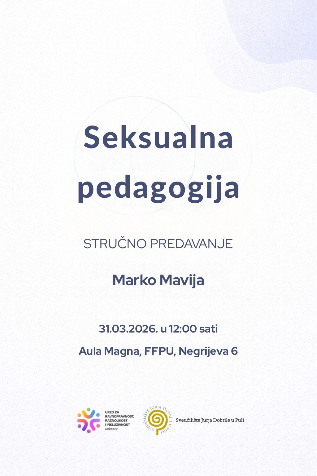 Ured za ravnopravnost, raznolikost i inkluzivnost poziva sve zainteresirane na predavanje „Seksualna pedagogija“, koje će održati psihoterapeut i seksualni pedagog Marko Mavija.